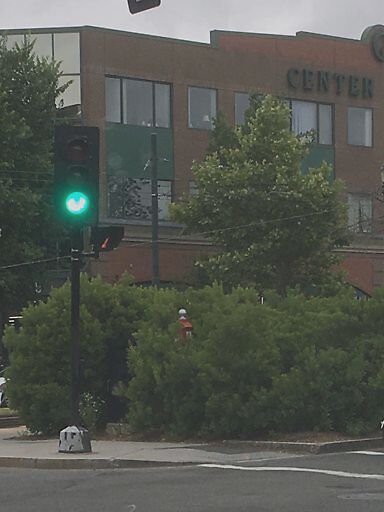 The emergency pull station on the median by the train tracks at the intersection of Beacon and Pleasant is nearly completely obscured by bushes. It can not be seen at all from the west or from the south - all but the very top is obscured from the north - and although largely visible from the east, bushes block clear access. It would be a struggle to use this box in an emergency, and if you were running from an attack, you would already be in the bushes having pushed yourself into complete seclusion to call from help.