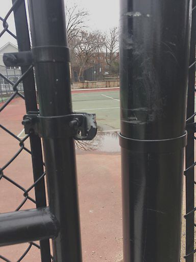 Latch is missing from new gate at the Stedman St. tennis courts.