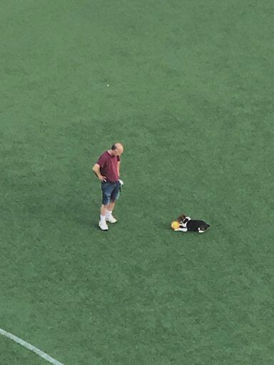 Another dog/owner on Coolidge Corner School artificial turf where signs are posted 'no dogs allowed on artificial field '.