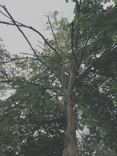 Looks like tree is dying. One branch is leafless and bark is peeling.