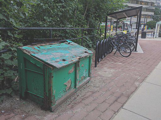 Wow. Salt/sand box is looking pretty rough. Sand all over the sidewalk & trash falling out from inside.